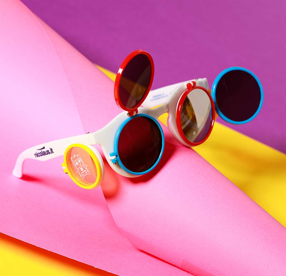 Matite colorate, occhiali da sole, sacche, tazze e calamite.