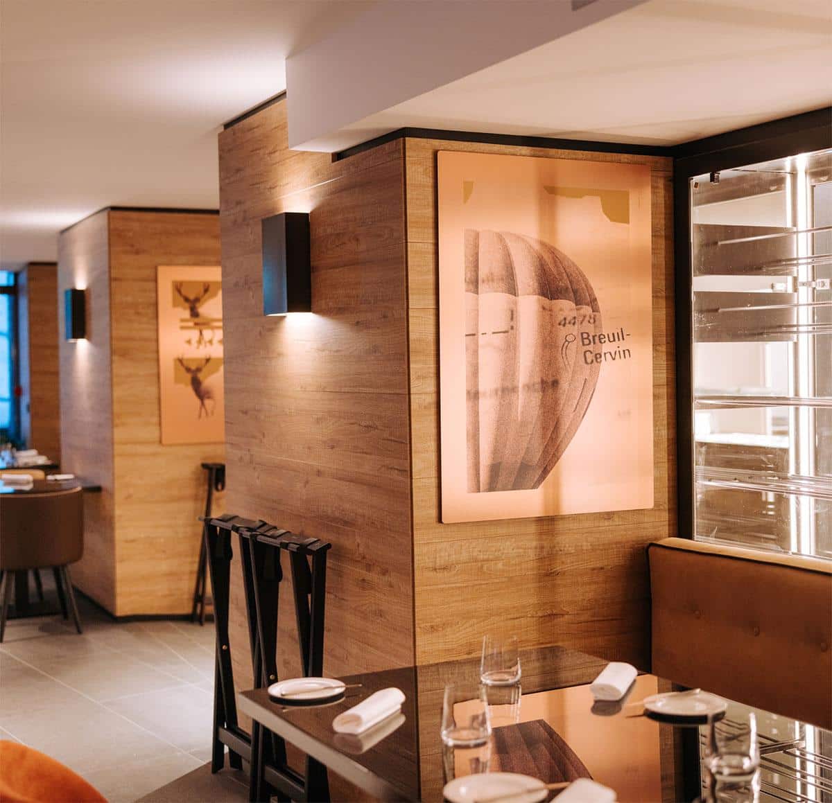Il bianco e nero delle figure legate al mondo della montagna, come sciatori e cervi, è reso pop dai colori degli elementi geometrici che le attraversano, giocando con prospettive e contrasti.